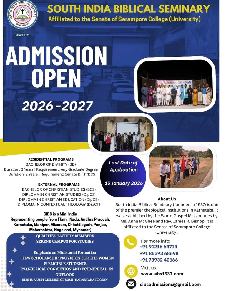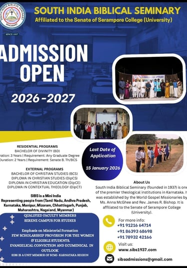 South India Biblical Seminary (founded in 1937) is one of the premier theological institutions in Karnataka. It was established by the World Gospel Missionaries; Ms. Anna McGhee and Rev. James R. Bishop. It is affiliated to the Senate of Serampore College (University) and accredited by the Asia Theological Association (ATA).